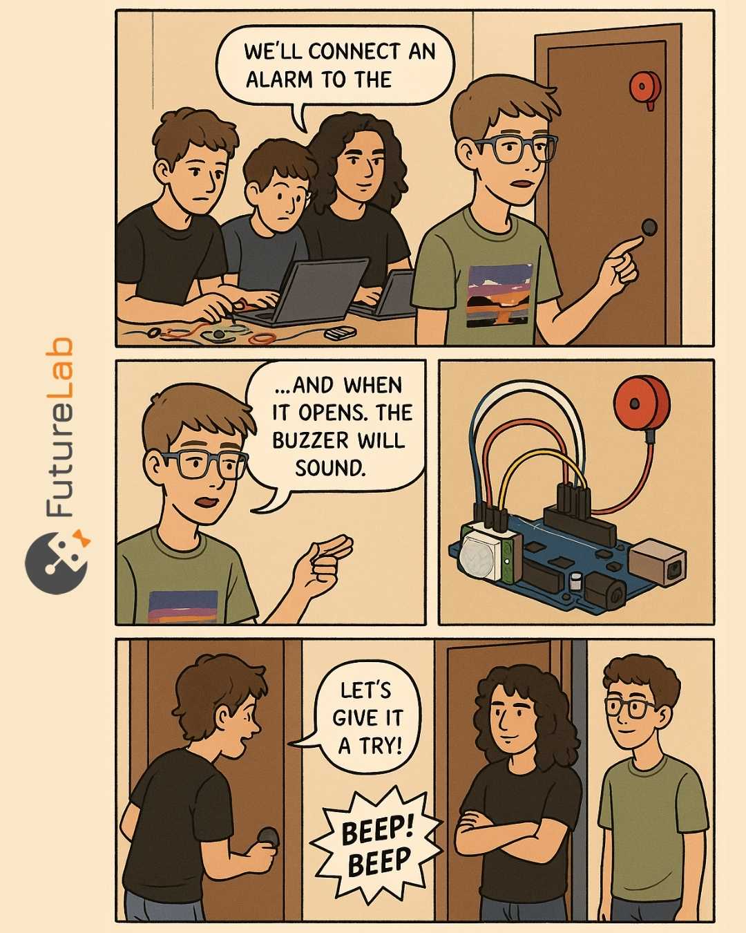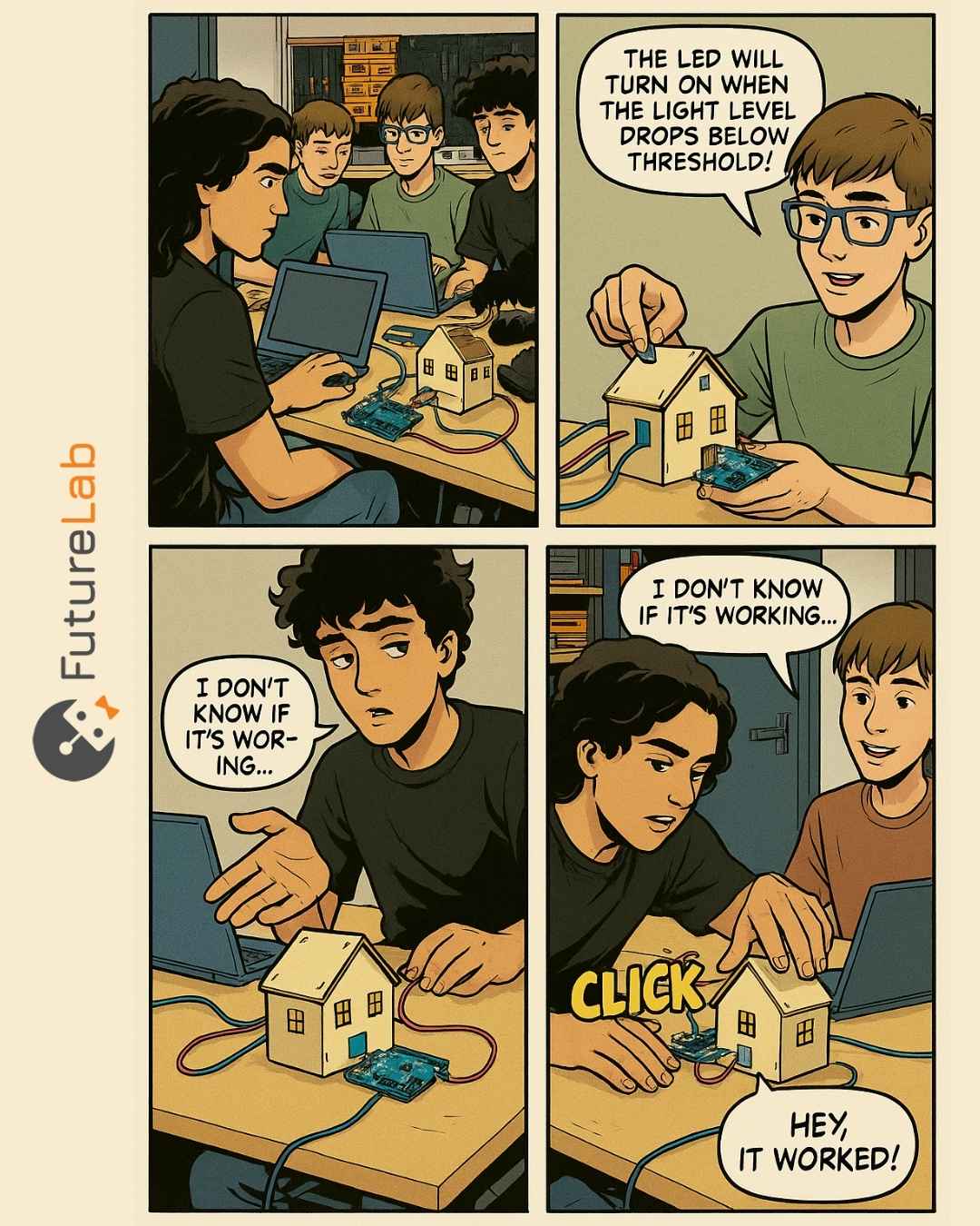 Έτσι γεννήθηκε η ιδέα ενός ψηφιακού κόμικ! Η κάθε φάση της κατασκευής, από το στήσιμο των κυκλωμάτων και το προγραμματισμό, μέχρι τις πρώτες δοκιμές με LEDs και αισθητήρες, παρουσιάστηκε με χιούμορ, δημιουργικότητα και φαντασία μέσα από καρέ. Και για να ζωντανέψει ακόμη περισσότερο αυτό το concept, αξιοποιήσαμε εργαλεία τεχνητής νοημοσύνης (AI) για να δώσουμε στις εικόνες στυλ και δομή κόμικ – πάντα βασισμένο στα αληθινά πρόσωπα, κατασκευές και σκηνικά του εργαστηρίου μας!